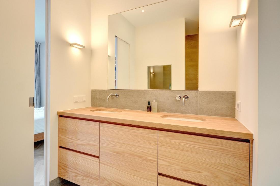 De bovenverdieping bestaat in zijn geheel uit een ruime hoge woonkamer met een keuken enigszins verstopt achter half hoge kasten met gladde stukwerk randen. De trap naar het dakterras valt achter een eveneens glad gestuukte balustrade. Op de verdieping eronder zijn een werk/logeerkamer met een doucheruimte en een ruime slaap/werkruimte met een ruime badkamer gesitueerd.